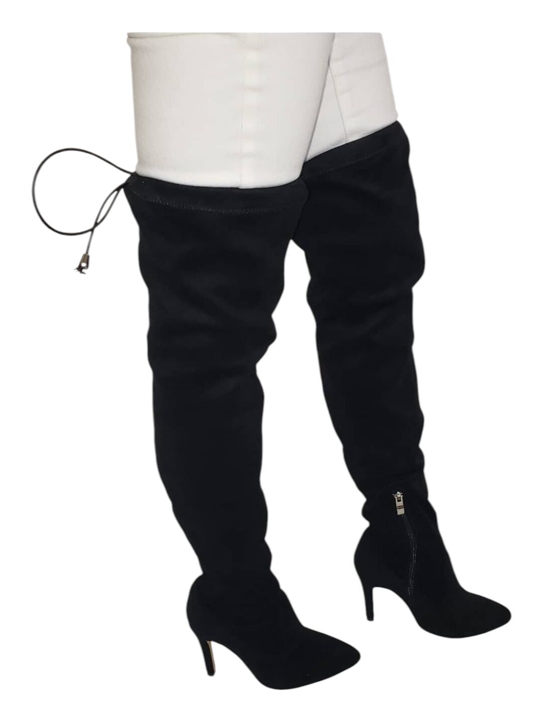 A slender 2 ½’’ heel beautifully complements the silhouette of a towering      over-the-knee boot crafted from micro-suede.